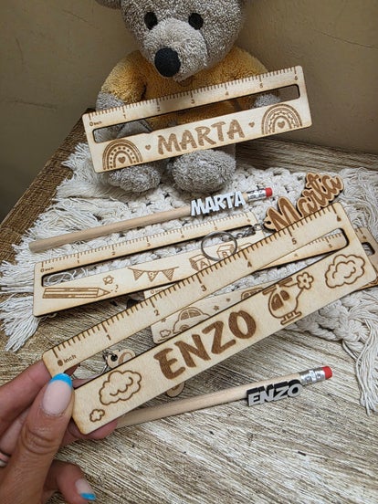 Portalapices de madera con inicial en color y lápiz con nombre en relieve del mismo color