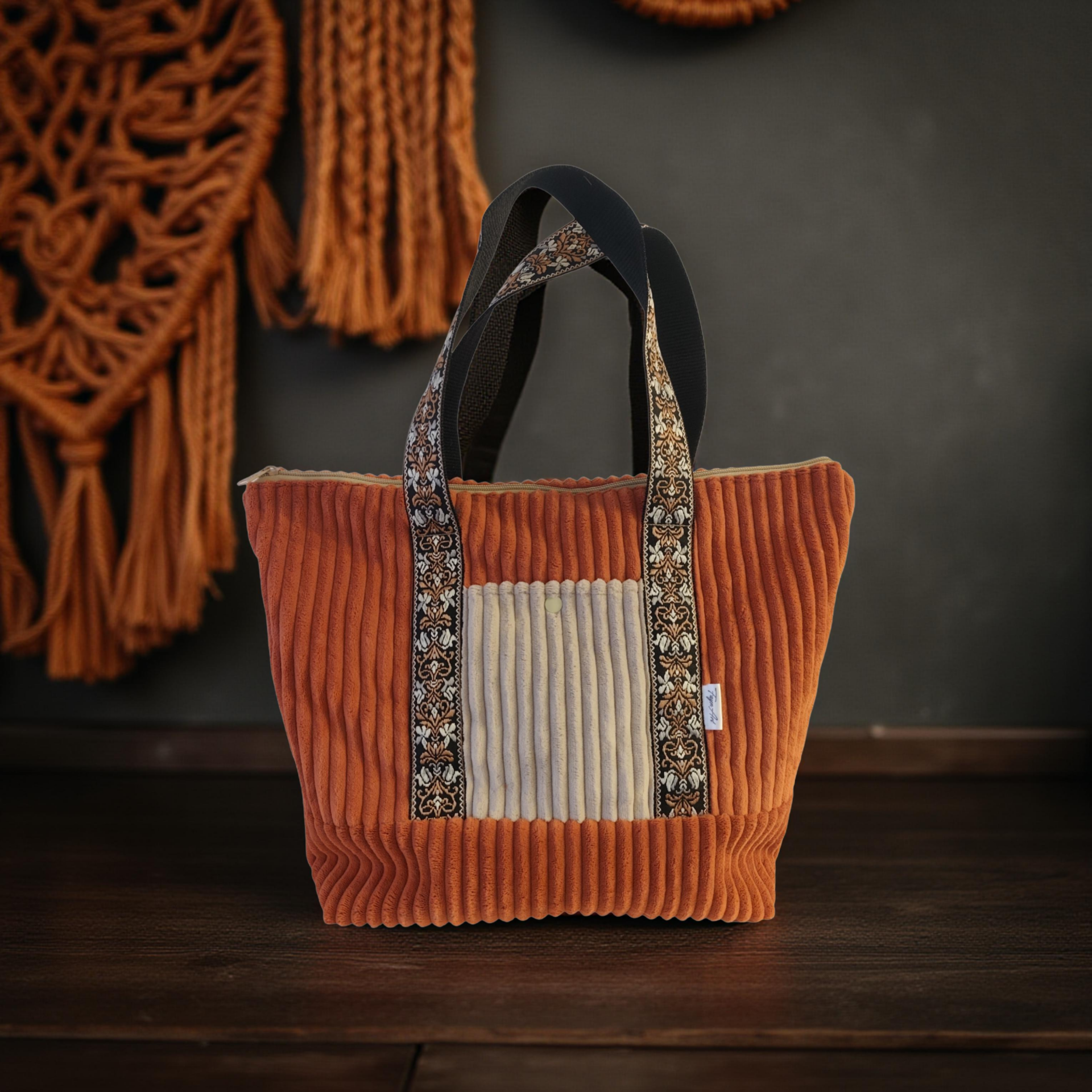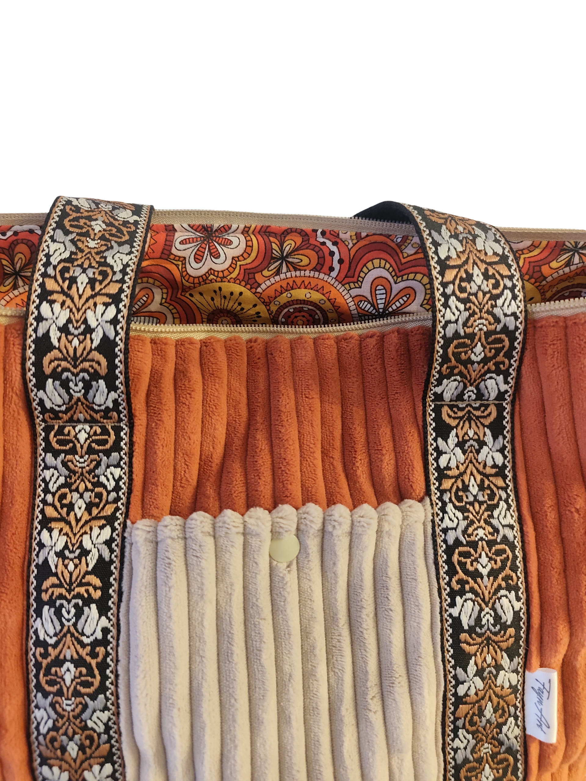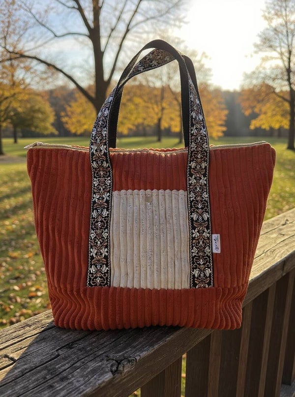 Bolso tipo tote bag de pana ancha, de 10mm de canal. En color teja, con bolsillos exteriores en beige. Interior en un estampado de algodón 100% con certificado OEKO TEX.
